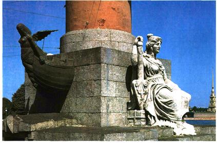 Рис. 34. Стрелка Васильевского острова в Санкт-Петербурге. Фрагмент Ростральной колонны Природный камень создает определенный колорит городской застройки, придает зданиям особое значение, помогает выделить роль общественных зданий в городских ансамблях, подчеркивает их монументальность и долговечность. Он прекрасно сочетается с новыми архитектурными формами, где его свойства оцениваются по-новому. Использование камня может также способствовать увязке архитектурных форм современных зданий с исторически сложившимися ансамблями. В процессе формирования архитектурных стилей, изменения методов строительства, создания новых строительных материалов и конструкций из них изменилась область использования природного камня в архитектуре. В прошедшие исторические эпохи, когда выбор строительных материалов в основном определялся местными ресурсами, наблюдалось единообразие строительных материалов для различных элементов здания. Постепенно технический прогресс, возрастание ценности человеческого труда, расширение палитры строительных материалов и усложнение структуры сооружений за счет включения в нее различных систем инженерного обеспечения привели к использованию для разных элементов зданий различных по своим свойствам строительных материалов. Расширились возможности выбора, в результате чего во всех элементах, где раньше использовался природный камень, ему нашли рациональную замену другим материалом, имеющим преимущество в большей индустриальности изготовления, или экономичности, или меньшей массы и т.д. Но и в современном строительстве имеются возможности и необходимость применения природного камня.