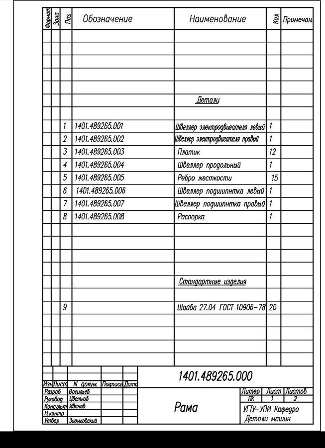 Спецификация является основным конструкторским документом для любой сборочной единицы и изделия. При работе над конструкцией необходимо решить, из каких самостоятельных сборочных единиц, деталей и материалов состоит изделие. Под самостоятельной сборочной единицей понимается изделие, которое собирается независимо от других изделий и может поступить на сборку более крупной сборочной единицы. Применительно к приводу такими изделиями могут быть двигатель, редуктор, муфта, рама. Спецификация отражает технологию сборки изделия. Поскольку целесообразно собирать каждую сборочную единицу из минимального числа элементов, то и при составлении спецификации необходимо стремиться к целесообразному минимуму позиций, содержащихся в ней. В учебном проекте спецификация включает разделы: - документация; - сборочные единицы; - детали; - стандартные изделия; - материалы. Заголовок каждого раздела записывают в графе «Наименование» и подчеркивают. После каждого заголовка в спецификации оставляют одну пустую строку. В конце каждого раздела перед заголовком оставляют не менее одной пустой строки. В раздел «Документация» включают основные документы конструкторской документации (чертеж общего вида и пояснительная записка). В разделе «Сборочные единицы» записывают изделия, состоящие из составных частей. В разделе «Детали» записывают нестандартные изделия, изготавливаемые без применения сборочных операций. В разделе «Стандартные изделия» записывают изделия, примененные по стандартам (государственным, отраслевым, предприятия). В разделе «Материалы» в учебном проекте ‑ смазочные материалы. Графы «Формат» и «Зона» в учебном проекте допускается не заполнять. В графе «Поз.» записывают номера позиций изделий, проставленные на сборочном чертеже. В разделах «Документация» и «Материалы» эта графа не заполняется. В графе «Обозначение» указывают: - в разделе «Документация» – обозначение чертежа общего вида; - в разделе «Сборочные единицы» – обозначение чертежей сборочных единиц; - в разделе «Детали» – обозначение рабочих чертежей деталей; - в разделе «Стандартные изделия» графа не заполняется. В графе «Наименование» указывают: - в разделе «Документация» – сборочный чертеж; - в разделах «Сборочные единицы» и «Детали» – названия сборочных единиц и деталей; - в разделе «Стандартные изделия» – условное обозначение изделия и номер ГОСТа. Если название сборочной единицы или детали состоит из двух или более слов, то сначала пишется имя существительное. Если в графе документа текст записан в нескольких строках, то в последующих графах записи начинают на уровне первой строки. В графе «Кол.» указывают количество одинаковых изделий в разделах «Сборочные единицы», «Детали» и «Стандартные изделия». В разделе «Стандартные изделия» запись производится по группам изделий, объединенных по их функциональному назначению (например, подшипники, крепежные изделия и т. д.). Для каждой группы запись ведется в алфавитном порядке наименований изделий. Например, в группе крепежных изделий: болты, винты, гайки, шайбы. Ниже приведены примеры условных обозначений стандартных изделий. Подшипник шариковый радиальный однорядный № 208: «Подшипник 208 ГОСТ 8338-75». Болт с диаметром резьбы 16 мм, длиной 60 мм, класса прочности 3.6, исполнения 1, с крупным шагом резьбы, с полем доп