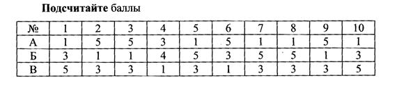 Инструкция: из предложенных ответов выберите один, с которым вы согласны. 1. Как часто вас терзают мысли, что вам не следовало говорить или де а) очень часто; б) иногда; в) практически никогда. 2. Если вы общаетесь с блестящим и остроумным человеком, вы: а) постараетесь победить его в остроумии; б) не будете ввязываться в соревнование, а отдадите ему должное и закончите разговор; в) поддержите беседу и постараетесь запомнить его шутки, чтобы 3. Выберите одно из мнений, наиболее вам близкое: а) то, что многим кажется везением, на самом деле — результат упорного труда; б) успехи зачастую зависят от счастливого стечения обстоятельств; в) в сложной ситуации главное — не упорство или везение, а чело- век, который сможет одобрить или утешить. 4. Вам показали шарж или пародию на вас, вы: а) рассмеетесь и обрадуетесь тому, что в вас есть что-то оригинальное; б) тоже попытаетесь найти что-то смешное в вашем партнере и вы- смеять его; в) обидитесь, но не подадите вида; г) уйдете, хлопнув дверью. 5. Вы всегда спешите, вам не хватает времени, вы беретесь за выполне а) да; б) нет; в) не знаю. 6. Вы выбираете туалетную воду в подарок подруге (другу). Купите: а) туалетную воду, которая нравится вам; б) туалетную воду, которой, как вы думаете, будет рад(а) подруга в) туалетную воду, которую рекламировали в недавней телепередаче. 7. Вы любите представлять себе различные ситуации, в которых вы а) да; б) нет; в) не знаю. 8. Задевает ли вас, когда ваши коллеги (особенно молодые) добиваются а) да; б) нет; в) иногда. 9. Доставляет ли вам удовольствие возражать кому-либо: а) да; б) нет; в) не знаю. 10. Закройте глаза и попытайтесь представить себе три цвета подряд а) голубой; б) желтый; в) красный.