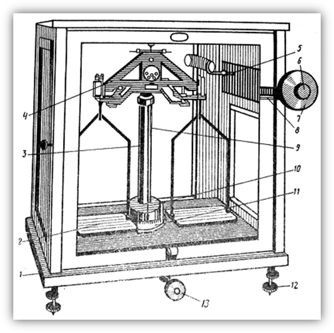 Малюнок 1: Лабораторні технічні терези ВЛТ-1кг-1: 1 - основа, 2 - майданчик, 3 - колонка, 4 - коромисло, 5 - важіль; 6, 7 - лімби; 8 - покажчик; 9 - стрілка; 10 - заспокоювач коливань, 11 - шкала-12 - гвинтова ніжка, 13 - ручка. Терези укладені в дерев'яну засклену вітрину, що має передню, що піднімається і дві бічні дверці. Вітрина прикріплена до дерев'яної основи 1. На ньому встановлена колонка 3 з опорною подушкою, на яку спирається середня призма коромисла 4. На кінцях коромисла в спеціальних сідлах закріплені вантажоприймальні призми, на які навішені сережки з вантажоприймальні подушками. До сережок прикріплені підвіски з плоскими майданчиками 2: одна для вантажу, що зважується, інша для гир. Терези мають гирьовий механізм з вбудованими в ньому міліграмових кільцевими гирями, що навішуються на планку, скріплену з правою сережкою. Накладення і зняття вбудованих гир виконують без відкриття дверець вітрини ваг за допомогою важелів 5 і обертових лімбів 6 і 7, розташованих на вітрині справа. При обертанні малого лімба 6 відбувається накладення або зняття десятків міліграмів, при обертанні великого лімба 7 – сотень міліграмів. Лімби обертаються незалежно один від одного. Масу вбудованих гир, накладених на праву підвіску терезів, відраховують за шкалами лімбів проти покажчика 8. На коромислі закріплена стрілка 9, на кінці якої зроблена лопать, вільно переміщається в порожнині масляного заспокоювача коливань 10. Відлік показань стрілки проводиться за шкалою 11, закріпленої в нижній частині колонки. Під підставою терезів змонтований ізолір, який приводиться в дію за допомогою ручки 13. Терези мають чотири регульовані гвинтові ніжки 12, що служать для установки терезів по схилу, розташованому за колонкою. На відміну від ваг ВЛТ-1 кг-1 ваги інших типорозмірів не мають гирьового механізму і навантаження в них врівноважується тільки гирями, що накладаються вручну на вантажоприймальний майданчик. Параметри ваг типу ВЛТ 1-го класу наведено в таблиці 4.
