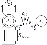 Регулирование скорости, пуск и торможение двигателя осуществляется с помощью резисторов, включенных в якорную цепь выбранного двигателя. Таким образом, на данном этапе работы выбирается схема питания двигателя от сети с реостатным регулированием скорости, с реостатным пуском в 2 - 3 ступени (в крайнем случае – 4) и с реостатным же торможением противовключением. Количество пусковых и тормозных ступеней резисторов определяется из расчета статических характеристик электропривода. В данной работе пуск осуществляется в три ступени, торможение противовключением. Проектируемый электропривод совместно с заданным производственным механизмом образует единую электромеханическую систему. Электрическая часть этой системы состоит из электромеханического преобразователя энергии постоянного или переменного тока и системы управления (энергетической и информационной). Механическая часть электромеханической системы включает в себя все связанные движущиеся массы привода и механизма. В качестве основного представления механической части принимаем двухмассовую расчетную механическую систему (рисунок 3), частным случаем которой при пренебрежении упругостью механических связей является жесткое приведенное механическое звено электропривода.