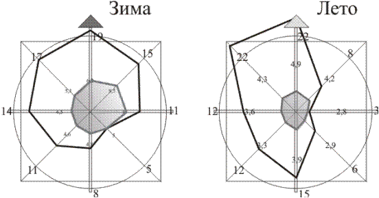 Летом господствующие – С, СЗ, Ю. Опасных нет (т.к. северный ветер летом является господствующим, - повторяемость 22%, а его скорость (4, 9м/с) приближается к границе опасного - 5м/с - то можно рекомендовать с севера защиту озеленением, эта же рекомендация относится к СЗ ветру P 22%, скорость 4, 3 м/с.