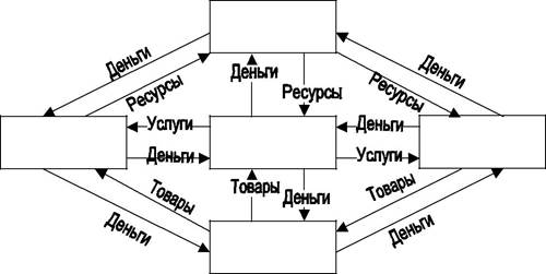 Домашние хозяйства, то есть все потребители и собственники ресурсов за деньги продают ресурсы, которые покупают за деньги производители товаров. Товары,, произведенные ими, они продают за деньги домашним хозяйствам. Покупка ресурсов и продажа товаров происходит посредством рынка товаров и рынка ресурсов. Особую роль играет в этой структуре государство. Оно за деньги закупает, как ресурсы, так и товары, а деньги получает за услуги оказываемые домашним хозяйствам и производителям.