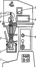 Реометр Штормера (рис. 3) является наиболее простым прибором, на котором измеряют частоту вращения рабочего ротора за определенное время при постоянном напряжении сдвига. Принцип работы прибора следующий. Испытуемый материал помещают в неподвижный внешний цилиндр 1, затем поднимают его на штативе 8 до такого положения, при котором вращающийся внутренний цилиндр 2 погрузится на определенную высоту в материал. Вращение цилиндра осуществляется за счет падающего груза 7, подвешенного на нити, перекинутой через блок 6 и барабан 5. Момент от барабана передается через зубчатую передачу 4 на ось рабочего цилиндра. Таким образом, испытание проводится при известном крутящем моменте (напряжении сдвига), а частоту вращения ротора определяют по счетчику 3, Большим преимуществом такого прибора является простота конструкции, а недостатком — короткое время для замера, равное продолжительности падения груза. Вискозиметр Реутова (рис. 4) нашел широкое применение в практике технологических лабораторий кондитерских предприятий. На нем определяется вязкость шоколада и других маловязких жидкообразных масс. От электродвигателя, установленного в корпусе 7, через редуктор вращение передается подставке 6, на которую устанавливают стакан 5 с испытуемым продуктом. В образец массы погружен свободно подвешенный на валике 4 металлический ротор в форме цилиндра с коническими торцовыми поверхностями. Валик укреплен в вилке, являющейся частью стержня 3. Стержень механически связан с пластинкой, на которой укреплен противовес 2. Поворот стержня фиксирует стрелка показывающего прибора 1. Порядок проведения опытов следующий. Испытуемую массу доводят до температуры, при которой предполагается измерение ее вязкости, и заполняют ею стакан 5 прибора. Пространство между двойными стенками заполняют водой, температура которой равна температуре испытуемой массы. Ротор погружают в массу и подвешивают к стержню измерительного механизма. После этого включают двигатель и, когда стрелка перестанет перемещаться по шкале, снимают показания. Перед опытами осуществляют тарировку прибора по жидкости с известной вязкостью, например касторовому маслу. Ротационные вискозиметры «Реотест» (Германия) также нашли широкое распространение. Помимо основного цилиндрического чувствительного элемента, эти приборы снабжены устройством типа конус — плоскость, предназначенным для измерения вязкости при повышенных скоростях сдвига для средне- и высоковязких продуктов. Угол между плоскостью и образующей конуса составляет 0, 3°. Прибор позволяет изменять скорость сдвига от 0, 56 до 4860 с-1, напряжение сдвига— от 40 до 2, 2-105 Па. Величина измеряемой вязкости находится в пределах от 8 до 40-107 МПа-с. Вискозиметр «Реотест-RV» (рис. 5) является одной из первых моделей этой марки. Внутри станины 1 прибора установлен синхронный электродвигатель, соединенный с 12-ступенчатой коробкой передач, которая позволяет изменять частоту вращения внутреннего цилиндра 2 от 0 до 1500 с- 1 . Крутящий момент от коробки передач передается ведущему валу 6 и далее через спиральную пружину 5 — ведомому валу 4, соединенному с внутренним цилиндром 2 муфтой. Наружный цилиндр 3 крепится к корпусу вискозиметра специальным зажимом. В приборе имеется термостатирующий сосуд. Величина крутящего момента отсчитывается по шкале п