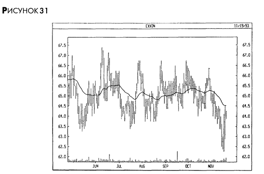 Скользящие средние и МАСD — это примеры следующих за тенденцией, или «запаздывающих», индикаторов (см. рис. 30). Такие индикаторы превосходно действуют при относительно длительных ценовых тенденциях. Они не предупреждают о предстоящих изменениях цен, а просто сообщают о направлении их движения (т.е. росте или падении), ориентируя вас на соответствующие действия. Покупая и продавая по сигналам индикаторов, следующих за тенденцией, вы лишите себя возможности более раннего входа в рынок, но зато значительно сократите степень риска, так как всегда будете играть в направлении господствующей тенденции.