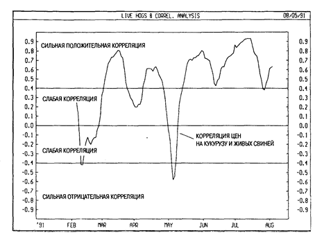 ПРИМЕР Следующий график иллюстрирует взаимосвязь цен на кукурузу и живых свиней. Высокие значения коэффициента корреляции показывают, что эта взаимосвязь сильна (исключая короткие периоды в феврале и мае): если цены на кукурузу изменяются, цены на свиней движутся в том же направлении.