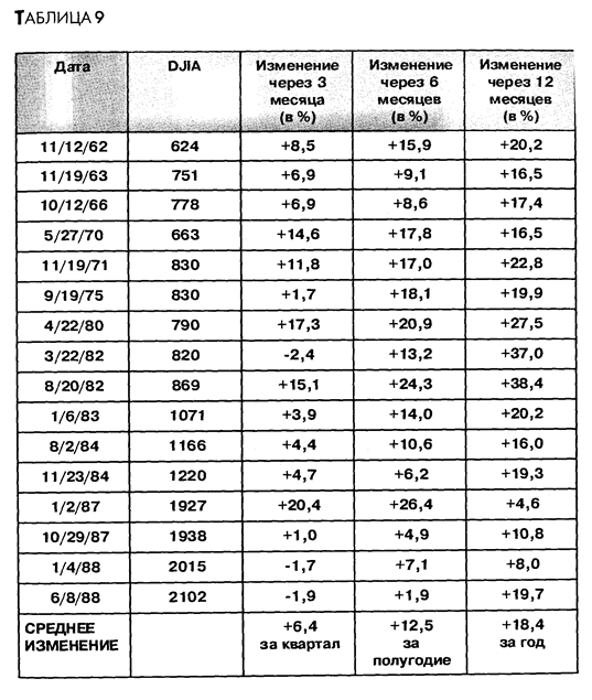 Коэффициент растущего/падающего объема показывает соотношение между объемами торгов по растущим и падающим в цене акциям на Ньюйоркской фондовой бирже. Растущий, падающий и неизменный объемы торгов рассматриваются на стр. 152. ИНТЕРПРЕТАЦИЯ Если значение коэффициента растущего/падающего объема больше 1, 0 — значит объем торгов по дорожающим акциям больше, чем по дешевеющим. Описывая в своей книге «Как победить на УоллСтрит» (Winning on Wall Street) коэффициент растущего/падающего объема, Мартин Цвейг утверждает: «Согласно имеющимся данным, все бычьи рынки и многие значительные среднесрочные подъемы начинались с всплеска покупок, который включал один или несколько дней типа " 9 к 1"»(дни, когда коэффициент растущего/падающего объема больше 9). «День " 9 к 1", — продолжает автор, — это очень обнадеживающий знак, а если за относительно короткий промежуток времени случается два таких дня, то это очень сильный бычий сигнал. Если два таких дня разделены промежутком не более трех месяцев, я называю это двойной комбинацией " 9 к 1"». В таблице 9 зафиксированы все сигналы к покупке, образованные двойной комбинацией «9 к 1», за период с 1962 года по октябрь 1994 года (в книге Мартина Цвейга таблица была составлена по 1984 год включительно). На момент написания этой книги новых сигналов с 8 июня 1988 года не возникало. ПРИМЕР На следующем рисунке показан график промышленного индекса ДоуДжонса почти за весь период 80х. Стрелками «покупка» отмечены места возникновения двойных комбинаций «9 к 1».