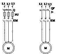 Защита предохранителями имеет существенный недостаток: - при перегорании одной из вставок двигатель будет работать на 2-х фазах и сгорит. При защите автоматическим выключателем отключаются сразу все 3 фазы. б) максимальная токовая защита. - осуществляется на реле максимального тока. Катушки токового реле включаются в 2-е или 3 фазы 3-х фазных двигателей в один или два полюса ДПТ.