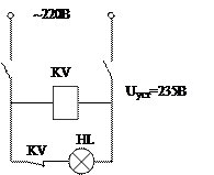 Выполняется на реле максимального напряжения. При напряжении равном или большем напряжению уставки, реле (KV) выключается, размыкая свой контакт, отключая лампочку от сети, предотвращая её перегорание от высокого напряжения.