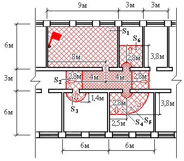где 1.3. Определяем форму развития пожара. На схему, выполненную в масштабе, наносим путь, пройденный огнем за время равное 20 мин. Форма площади пожара сложная (рис. 5.3). На рис. 5.3 «а» показаны расстояния до центра дверных проемов.