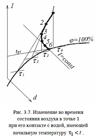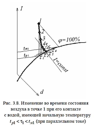 В первый расчетный интервал времени малая часть орошаемого воздуха войдет в контакт с поверхностью капель и приобретет начальную температуру воды t1 и φ =100 %. Эта часть воздуха смешивается с остальной массой воздуха, имеющей параметры точки 1, и точка смеси 2 будет находиться на прямой линии, соединяющей точку воздуха начального состояния 1 и точку на линии φ = 100 %, соответствующую начальной температуре воды t1. В начале второго расчетного интервала в результате теплообмена с воздухом температура воды повысится до t2, а воздух будет иметь параметры точки смеси 2. За второй интервал времени часть воздуха приобретает параметры t2 и φ = 100 %. Образуется новая смесь воздуха, состояние которой определяется точкой 3, а вода повысит свою температуру до t3, и т.д. В первом интервале времени (в начале процесса) теплообмен между водой и воздухом будет протекать интенсивно за счет явного и скрытого обмена теплом при большом перепаде температур. Если температура воды поднимется выше температуры точки росы воздуха, интенсивность теплообмена резко уменьшится: прекратится отдача скрытого тепла конденсацией, и по мере повышения температуры воды начнется испарение, увлажнение воздуха и передача ему тепла парообразования. Воздух будет отдавать явное тепло воде, но частично оно будет возвращаться воздуху в виде скрытого тепла водяного пара. Изменение температуры воды и воздуха будет происходить медленнее. Постепенно температура воды будет продолжать повышаться, энтальпии воздуха на поверхности воды и очередной смеси движущегося воздуха будут приближаться друг к другу. В конце концов вода приобретет температуру мокрого термометра текущей смеси воздуха, энтальпия которой будет равна энтальпии воздуха на поверхности контакта с водой. Начиная с этого момента процесс увлажнения воздуха будет адиабатическим: температура воздуха будет понижаться, не изменяя энтальпию, а температура воды будет оставаться неизменной и равной температуре мокрого термометра воздуха (см. рис. 3.7 точки 4, 5 и 6). Подобного рода рассуждения остаются справедливыми и для условий, когда начальная температура воды выше температуры точки росы и