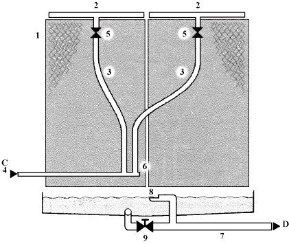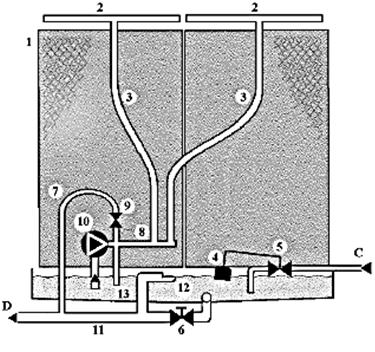 2 – коллекторы с форсунками; 3 – водораспределительный шланг; 4 – поплавок; 5 – поплавковый клапан; 6 – клапан слива из поддона; 7 – отводной слив; 8 – распределительный коллектор; 9 – клапан регулирования расхода воды; 10 – насос; 11 – сливной трубопровод; 12 – перелив; 13 – сброс давления; А – подаваемый воздух; В – увлажненный воздух; С – холодная вода из магистрального трубопровода; D – сливаемая вода В системе с непосредственной подачей вода из водопровода посту- пает через клапаны постоянного расхода прямо в распределительный кол- лектор (рис. 7.6). Клапаны постоянного расхода воды обеспечивают тре- буемые значения расхода воды и давления, необходимые для ее распреде- ления. Избыток воды, не расходуемой на испарение, промывает кассеты и сбрасывается через дренажные трубопроводы в канализацию.