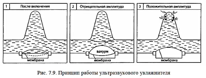 Ультразвуковые увлажнители воздуха работают по принципу сверх- звукового затуманивания. В электрической схеме с помощью трансформа- тора создается переменный ток с напряжением 48 V и высокой частотой 1, 65 MHz. Высокочастотный электрический сигнал подается на установ- ленный в водяной ванне вибратор, который преображает его в высокочас- тотные механические колебания. Поверхность вибратора колеблется с та- кой высокой скоростью, что вода из-за сил инерции не успевает оседать и выстраивается сразу же после включения прибора в водяной столб над вибратором. Во время отрицательной амплитуды вибратора вода не успе- вает за быстрыми движениями вибратора, вследствие чего возникает мо- ментальный вакуум. Затем возникают пузырьки воздуха, которые в период положительной амплитуды всплывают на край водяного столба и там сталкиваются друг с другом с большой силой. При этом мельчайшие час- тицы воды распыляются на границе воздушного столба (рис. 7.9).