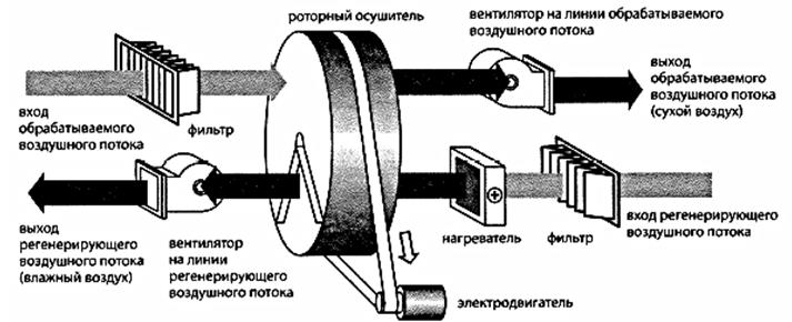 Часто повышенная относительная влажность воздуха в помещении приводит к накоплению влаги в ограждающих конструкциях, что ведет к их повреждению и разрушению в условиях отрицательных температур на- ружного воздуха. Повышенная относительная влажность также неблаго- приятно сказывается на хранении материалов и изделий (коррозия метал- лических изделий, плесень на текстильных материалах и мехах, потеря ок- раски и появление пятен на упаковках и готовой продукции, слеживание сыпучих пищевых продуктов, разрушение музейных экспонатов и книг в хранилищах). Поддержание заданного значения относительной влажности воздуха в помещениях со значительными влаговыделениями, таких, как плаватель- ные бассейны, бани, прачечные, моечные, подвальные помещения с пло- хой гидроизоляцией, влажные цеха текстильной промышленности, гальва- нические цеха, водохозяйственные и гидротехнические помещения, скла- ды материалов, чувствительных к изменению относительной влажности, зоомагазины и т.д., требует осушения наружного воздуха в теплое время го- да, а иногда, по требованию технологического процесса, и круглогодично. Существуют три способа осушения воздуха, основанные на физиче- ских явлениях адсорбции, абсорбции и конденсации водяных паров. Первый способ основан на сорбционных свойствах твердых ве- ществ, называемых адсорбентами. Явление адсорбции заключается в по- глощении паров, газов или растворенных веществ поверхностью особых твердых веществ с капиллярно-пористой структурой, таких, как силика- гель, алюмогель, активированный уголь и др. Чаще всего в системах кондиционирования воздуха применяется си- ликагель, представляющий собой стекловидное пористое вещество, полу- чаемое путем обработки жидкого стекла минеральной кислотой. Адсорби- рующая способность силикагеля зависит от температуры осушаемого воз- духа, при температуре воздуха выше 35 °С способность поглощения влаги заметно уменьшается. При адсорбции конденсация водяных паров в капиллярах сопровож- дается выделением теплоты конденсации и теплоты смачивания. Выде- ляющаяся теплота адсорбции повышает температуру адсорбента и осу- шаемого воздуха, поэтому использование такого способа целесообразно в том случае, когда надо осушить и нагреть воздух. Слой адсорбента по мере насыщения влагой перестает поглощать влагу из воздуха и требует регене- рации – восстановления адсорбционных свойств. Регенерация осуществля- ется продувкой через адсорбент нагретого воздуха. Данный способ осушения воздуха реализуется в роторных осушите- лях, принцип работы которых показан на рис. 7.11. Рис. 7.11. Принцип работы роторного осушителя