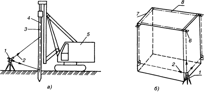 лазерного пучка и цилиндрического уровня должны быть параллельны. В настоящее время лазерные нивелиры выпускают в основном с автоматически горизонтирующимся пучком излучения, вращающимся лазерным пучком и другими особенностями. Примером может служить лазерный нивелир LNA2L фирмы " Вильд" (рис. 9.1, а), задающий вращающуюся световую горизонтальную плоскость. Положение этой плоскости фиксируется на специальной рейке или на стенах зданий (рис. 9.1, б). Нивелир может быть установлен так, чтобы описывалась вертикальная световая плоскость (рис. 9.1, в). Он снабжен вычислительным устройством, выполняющим автоматическое вычисление высот. Кроме того, с помощью этого нивелира по рейке можно определять расстояния до 100 м. В лазерных теодолитах (рис. 9.2, д), предназначенных для задания створов и измерения углов, вместо визирной оси в пространстве создается узконаправленный пучок света. Наличие горизонтального 1 и вертикального 2 кругов позволяет придавать пучку излучения нужную ориентировку. Как правило, визирная марка (рис. 9.2, б) при применении лазерных теодолитов в условиях строительной площадки совмещена с шаблоном для разметки ориентирных рисок. Марка 5 со стержнем б крепится на опоре 5, а ее высота регулируется стойкой 7 и фиксируется закрепительным винтом 4. Ориентирные риски проводят по щечкам опоры 3. Многоцелевые приборы, предназначенные для контрольно-измерительных операций при установке конструкций, опалубки, выемке грунта, устройстве земляного полотна, укладке бетона, совмещают в себе визирную оптическую трубу и установленный на нее квантовый генератор. Рассмотрим некоторые из этих приборов. Прибор ПГЛ-1 состоит из фотоприемного устройства (рис. 9.3, а) и передающей части (рис. 9.3, б). Фотоприемное устройство состоит из фотоприемника импульсных сигналов и измерительной рейки 6. Результаты измерений регистрируются на стрелочном приборе. Фотоприемник перемещают вдоль рейки до появления показаний на стрелочном приборе. Передающая часть включает в себя лазерный передатчик, формирующий излучение в виде световых линий