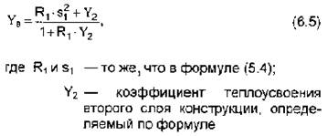 B = --------, (6.3) 1, 08Rт где Rт - сопротивление теплопередаче заполнения светового проема, принимаемое по приложению Г. 6.4 Коэффициент теплоусвоения внутренней поверхности однородной наружной ограждающей конструкции следует принимать равным коэффициенту теплоусвоения материала конструкции s, принимаемому по приложению А. 6.5 Коэффициент теплоусвоения внутренней поверхности многослойной наружной ограждающей конструкции необходимо определять в зависимости от тепловой инерции слоев конструкции следующим образом. 6.5.1 Если тепловая инерция первого слоя конструкции (считая от внутренней поверхности), определяемая по формуле (5.4), D1 > = 1, коэффициент теплоусвоения внутренней поверхности конструкции следует принимать равным коэффициенту теплоусвоения материала первого слоя конструкции s, принимаемому по приложению А. 6.5.2 Если тепловая инерция первого слоя ограждающей конструкции D1 < 1, а первого и второго слоев конструкции D1+D2 > = 1, коэффициент теплоусвоения внутренней поверхности следует определять по формуле R1 • (s1)2 + s2 Yв = -----------------, (6.4) 1 + R1 • s2 где R1, s1, s2 - то же, что в формуле (5.4).