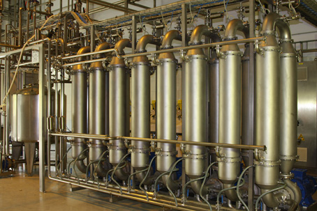 Создание мембранной техники для баромембранных процессов основывается на использовании тех или иных видов селективно проницаемых мембран. Имеющиеся мембраны следует разделить на два класса: из органических материалов (полимерные) и неорганических материалов. Практическое применение получили керамические мембранные элементы трубчатого типа. Длительный срок эксплуатации (не менее 10 лет); стойкость к температуре (до 300°С); стойкость к щелочным и кислотным средам (рН 0–14); механическая прочность керамических мембранных элементов позволили не только упростить конструкции оборудования, но и создать новые технологии переработки молочных продуктов. Фильтрат, выходящий из ультрафильтрационной установки, охлаждают до температуры (8±2) °С и направляют в резервуар для хранения. Полученный после ультрафильтрации концентрат (творожную основу) подают на охладитель. После первой секции охладителя в потоке в творожную основу с помощью насоса–дозатора вносят раствор стабилизатора с температурой (40±5)0С. Во второй секции смесь творожной основы и раствора стабилизатора охлаждают до температуры (20±5)0 С. Внесение наполнителя в смесь творожной основы и раствора стабилизатора проводят в потоке с помощью насоса-дозатора или в резервуаре в соответствии с рецептурой. Продукт перемешивают в резервуаре в течение 10–15 мин и доохлаждают до температуры (10±2)° С. Хранение продукта перед фасовкой допускается не более 2 ч. Упакованный продукт направляют в холодильную камеру на доохлаждение до температуры (4±2)° С.