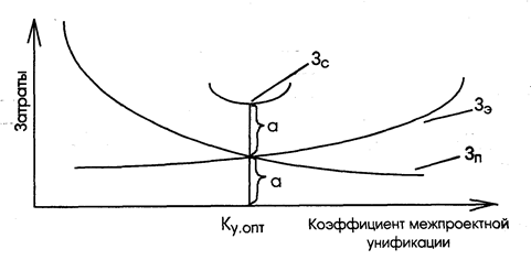 Рис. 5.9. Зависимость затрат в сферах производства (3п) и эксплуатации (Зэ) объекта от коэффициента межпроектной унификации составных частей объекта (Км.у)
