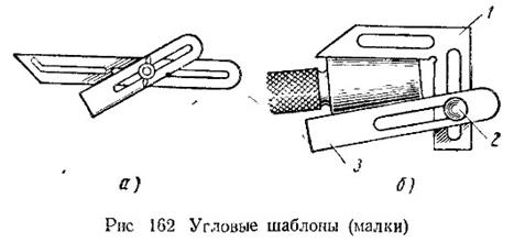 Универсальным инструментом для измерения конусов является угломер системы Семенова (рис 160). Он состоит из основания 4, на котором нанесена основная градусная шкала, и сектора 6 с нанесенным на нем нониусом 7. Сектор можно вращать по основанию. С помощью державки 9 на секторе можно закрепить угольник 2, на котором при помощи державки 3 закрепляется съемная линейка 1. Линейка 8 жестко связана с основанием 4. Винт 5 служит для скрепления сектора 6 с основанием. Показания угломера отсчитываются по основной шкале и нониусу. Ниаменьший отсчет по нониусе равен 2'. Угловые шаблоны. Если требуется обработать конус по образцу, то для сравнения конусности можно пользоваться установочным угловым шаблоном (малкой). Такой шаблон может состоять из двух линеек (рис. 162, а) или угольника 1 и линейки 3 (рис. 162, б), снабженных прорезями для соединительного винта 2. Отсоединив гайку винта, можно угольник и линейку поставить под необходимым углом друг к другу (рис. 162, б).