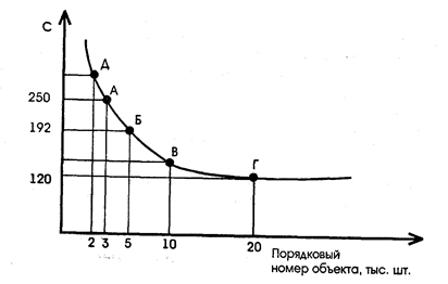 Рис. 10.5. Зависимость между себестоимостью объекта и его порядковым номером с начала серийного выпуска