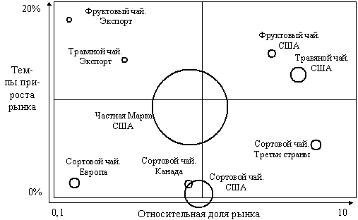 Рис. 7. Модель BCG бизнеса организации Ренди на рынке чая Если в отношении будущего такой бизнес-области, как " чай частных марок США", можно еще подумать на предмет того, продолжать делать сюда инвестиции для сохранения своей доли на рынке или нет, то в отношении " сортового чая из Европы", " сортового чая из Канады" и " сортового чая из США" все оказывается предельно ясно. От такого рода бизнеса надо освобождаться и как можно скорее. Инвестиции в поддержание этого бизнеса, которые делает организация Ренди, не приводят ни к увеличению доли на рынке, ни к увеличению прибыли. К тому же, сам рынок этих видов чая показывает явную тенденцию к замиранию. Очевидно, что организация Ренди явно не замечает тех перспектив, которые связаны с развитием рынка " фруктового чая США" и " травяного чая США". Эти области бизнеса – явные " звезды". Инвестиции в развитие доли на этом рынке в ближайшем будущем могут обернуться значительным доходом.