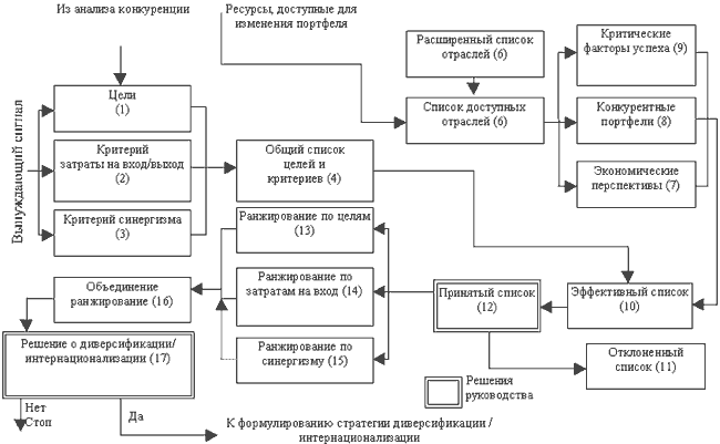 Рис. 12. Последовательность принятия решений в портфельном анализе планирует возместить затраты на вход в отрасль. В случае, когда диверсификация осуществляется с помощью поглощения какой-то организации, в список критериев заносится максимальное уменьшение дохода на одну акцию, которое может принять организация, или же другой критерий, указывающий, что распределение акций после приобретения должно проводиться так, чтобы руководство не потеряло контроль над поглощаемой организацией. Так как диверсификация связана с повышением рисков, следующим критерием должны быть затраты на выход, которые готова понести организация, если ей придется покинуть избранную область. Данные затраты особенно важны при международной деятельности организации. Ярким примером тому служат огромные потери, которые понесли американские организации, когда им пришлось сворачивать свою деятельность в странах, национальное законодательство которых предусматривало высокие расходы при сокращении штатов. 3. Критерий синергизма определяет, какие характеристики областей-кандидатов должны быть общими с другими элементами настоящего портфеля организации. Их еще называют общими направлениями, которые будет поддерживать организация между своими подразделениями по мере диверсификации. На заре диверсификации критерии синергизма связывались в основном с функциональными подразделениями: отделами маркетинга, исследований и разработок и т. д. Но, как показал опыт, самым важным критерием синергизма чаще всего оказывается синергизм корпоративного управления. Причина заключается в том, что, когда синергизм корпоративного управления с новым видом деятельности отрицателен, существует опасность, что руководство по ошибке будет уделять этой деятельности " смертельно большое" внимание. Мы уже как-то говорили, что за последние годы в деловой прессе постоянно появляются сообщения об отказе от перемещений, сделанных в ходе диверсификации, по причине того, что их руководству уделялось так много времени и сил, что они стали хронически убыточными. Как видно из рис. 12, все три списка объединяются в общий список целей и критериев (4), с помощью которого и будут оцениваться альтернативные варианты диверсификации. На следующем этапе портфельного анализа заполняется расширенный список (5) отраслей или стратегических областей бизнеса. Использование целых отраслей для описания диверсификационных перемещений является обычной практикой, так как в большинстве развитых стран существует стандартная отраслевая статистика – готовые данные по каждой отрасли. В 1950-1960-х годах в расширенных списках отражались или альтернативы диверсификации, или варианты интернационализации. Пользуясь современными знаниями, в расширенный список можно включать и те, и другие варианты. При окончательном анализе этот расширенный список нужно сократить, исходя из следующих соображений: во-первых, существует круг интересов руководства организации, а, во-вторых, ресурсы, которые выделяются на исследование отраслей из списка, не безграничны. А затраты эти могут быть очень существенны. Но эти затраты можно ограничить, приняв во внимание тот факт, что коренное изменение деятельности организации – важное и крайне рискованное решение. При объединении представляющихся перспективными под-, или да