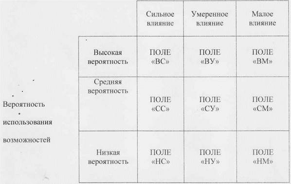 Данная матрица строится следующим образом: сверху откладывается степень влияния возможности на деятельность организации (сильное влияние, умеренное влияние, малое влияние); сбоку откладывается вероятность того, что организация сможет воспользоваться возможностью (высокая вероятность, средняя вероятность, низкая вероятность). Полученные внутри матрицы девять полей возможностей имеют разное значение для организации. Возможности, попадающие в поля «ВС», «ВУ» и «СС», имеют большое значение для организации, и их надо обязательно использовать. Возможности же, попадающие на поля «СМ», «НУ» и «НМ», практически не заслуживают внимания организации. В отношении возможностей, попавших на оставшиеся поля, руководство должно принять позитивное решение об их использовании, если у организации имеется достаточно ресурсов. Похожая матрица составляется для оценки угроз (рис. 9). Сверху откладываются возможные последствия для организации, к которым может привести реализация угрозы (разрушение, критическое состояние, тяжелое состояние, «легкие ушибы»). Сбоку откладывается вероятность того, что угроза будет реализована (высокая вероятность, средняя вероятность, низкая вероятность). Те угрозы, которые попадают на поля «ВР», «ВК» и «СР», представляют очень большую опасность для организации и требуют немедленного и обязательного устранения. Угрозы, попавшие в поля «ВТ», «СК» и «HP», также должны находиться в поле зрения высшего руководства и быть устранены в перспективном порядке. Что касается угроз, находящихся на полях «НК», «СТ» и «BТ», то здесь требуется внимательный и ответственный подход к их устранению. Попавшие на оставшиеся поля угрозы также не должны выпадать из поля зрения руководства организации, и должно осуществляться внимательное отслеживание их развития, хотя при этом не становиться задача их первостепенного устранения.