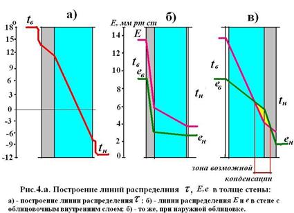 Определить из условий конденсации влаги допустимость применения и построить линии величин насыщения парциального давления водяного пара наружной стена жилого дома в г. Пятигорске. Данные для расчета принимаются из примеров №№2 и 3, - расчетная средняя наружная температура наиболее холодного периода -16оС [2, графа 26], - нормативная относительная влажность Температуре tв =+18оС соответствует (табл.3) максимальное парциальное давление водяного пара Е=15, 48 мм рт.ст., температуре на внутренней поверхности