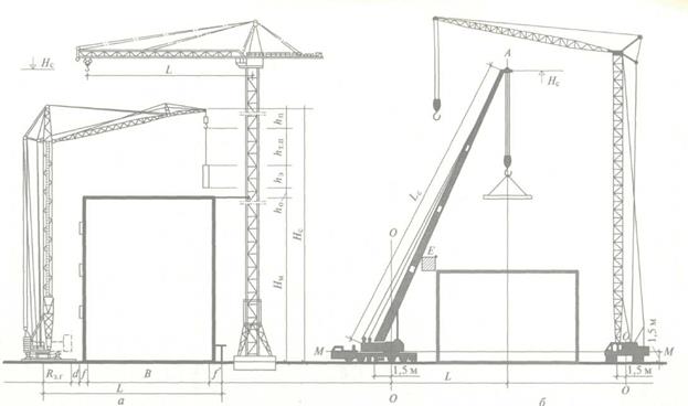 Рис. 11.5. Методы определения параметров кранов: а — башенных; б — стреловых