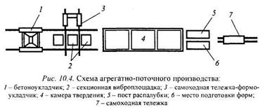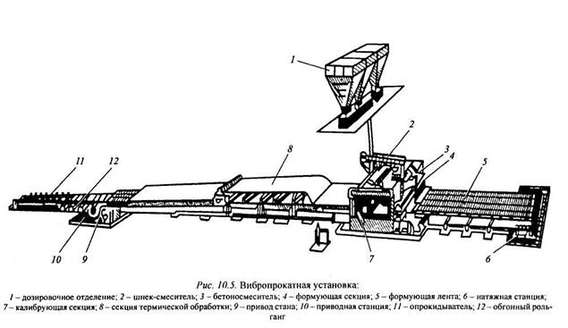 При заводском изготовлении железобетонных изделий широкое распространение нашли три основных способа производства: агрегатно-поточный, конвейерный и стендовый. Разновидностью стендового способа является кассетный. Агрегатно-поточный способ (рис. 10.4) изготовления конструкций характеризуется расчленением технологического процесса на отдельные операции или их группы, выполнением нескольких разнотипных операций на универсальных агрегатах, наличием свободного ритма в потоке, перемещением изделия от поста к посту. Формы и изделия переходят от поста к посту с произвольным интервалом, зависящим от длительности операции на данном рабочем месте, которая может колебаться от нескольких минут (например, смазка форм) до нескольких часов (пост твердения отформованных изделий). Агрегатно-поточный способ отличается также тем, что формы и изделия останавливаются не на всех постах поточной линии, а лишь на тех, которые необходимы для данного случая. Агрегатно-поточный способ организации производства характеризуется возможностью закрепления за одной поточной линией изделий, различных не только по своим типоразмерам, но и по конструкции. Эта возможность обеспечивается наличием на поточной линии универсального оборудования. Напорные железобетонные трубы диаметром 1200...2000 мм изготавливают путем центрифугирования по трехстадийной технологии. Конвейерный способ характеризуется следующими признаками: максимальное расчленение технологического процесса на операции, выполняемые на отдельных рабочих постах, перемещение форм и изделий от поста к посту с регламентированным ритмом. Изделия в процессе обработки передаются конвейерным устройством пульсирующего действия автоматически; при этом создаются условия для более полной синхронизации. Конвейерная организация производства характеризуется принудительным ритмом, т.е. перемещение формуемых изделий осуществляется в строгой последовательности через одни и те же формовочные посты, с определенной заданной скоростью передвижения. Это требует комплексной механизации операций и применения автоматического технологического оборудования. Обычно для межоперационного транспорта применяют механизированные транспортные средства линейного типа - тележечные конвейеры, состоящие из определенного количества поддонов-тележек, которые перемещаются тяговой цепью по рельсовым путям. На вибропрокатных установках (рис. 10.5) имеется непрерывно движущаяся формующая лента, выполненная из объемных или плоских пластин. На ленту наносят смазку, затем укладывают арматурный каркас, бетонную смесь с помощью бетоноукладчика, который равномерно распределяет ее по ширине формующей ленты. Уплотняют бетонную смесь путем вибрирования и частично прокатом. До проектной толщины изделие калибруется калибрующим механизмом.