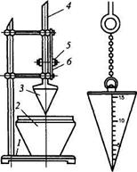 Рис. 11.1. Прибор для определения подвижности растворной смеси: а - общий вид (/ - штатив; 2 - сосуд для раствора; 3 - конус; 4 - трубка; 5 - стрелка; 6 - шкала); б - конус СтройЦНИЛа В зависимости от подвижности растворные смеси подразделяют на марки (табл. 11.1).