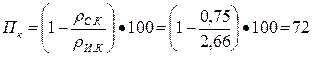 где Так как Пример 3.13. Зерно керамзитового гравия объемом Vк = 28 см3 плавает в воде, погружаясь на ¾ своего объема. Определить пористость керамзита, принимая истинную плотность его равной pи.к = 2, 66 г/см3. Водопоглощение керамзитового гравия при этом можно не учитывать. Решение: Масса плавающего зерна керамзита равна массе (объему) вытесненной им воды, т. е. mк = Vк ∙ ¾ = 28 ∙ ¾ = 21 г. Средняя плотность керамзита в куске