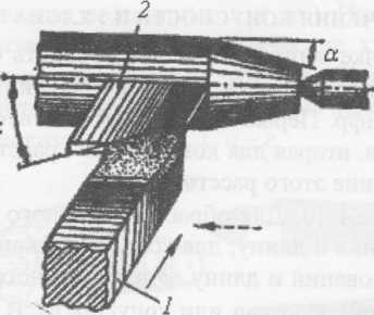 Угловым резцом 1 (рис. 3) обрабатывают с продольной или поперечной подачей наружные и внутренние конусы небольшой длины до 20...25 мм. Режущая кромка такого резца должна быть строго прямолинейная, без дефектов (забоин, завалов, зазубрин). Правильная установка широкого углового резца относительно оси обрабатываемой детали контролируется шаблоном 2.