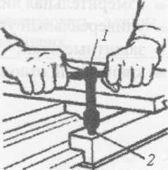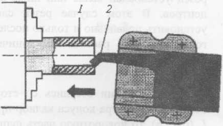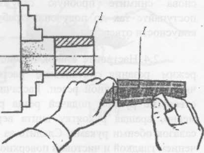 5. Обточите коническую поверхность 2 (рис. 4). Резец 1 подавайте поперечной подачей, вращая рукоятку винта нижних поперечных салазок суппорта обеими руками.
