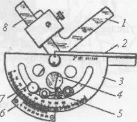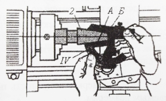 2.4. Проверьте угол конуса универсальным угломером. Универсальный угломер IV (рис. 7) предварительно установите на требуемый угол конуса и по плотности прилегания измерительных поверхностей А и Б линеек к образующей конической поверхности детали 2 определите величину угла конуса. Линейки угломера установите непосредственно по обрабатываемой детали, а затем по показанию на градуированной шкале определите величину полученного угла конуса. 2.5. Обточите коническую поверхность начисто.