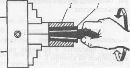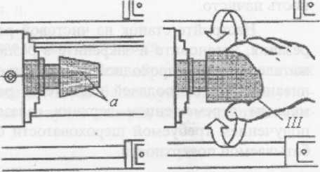 2. Проверка получаемой конусности 2.1. Коническую калибр-пробку I (рис. 3) возьмите в левую руку, а кусочек мела - в правую. С легким нажимом проведите на поверхности калибр-пробки несколько меловых линий (три-четыре). Следите, чтобы на проведенных линиях не оставались крупинки мела. Вместо меловых линий можно нанести на поверхности калибра тонкий слой краски. 2.2.