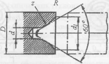 где S - величина поперечного сдвига задней бабки, мм; L - общая длина детали, мм; I - длина конуса, мм; К - конусность. Величину смещения задней бабки можно установить измерением расстояния между боковыми сторонами плиты и корпуса бабки, по шкале на заднем торце плиты, по лимбу поперечной подачи. В последнем случае резец, закрепленный обратной стороной в резцедержателе, подводят до касания с пинолью задней бабки. Затем, пользуясь лимбом поперечной подачи, передвигают резец в нужном направлении на установленную величину и вновь прижимают к нему пиноль. Поперечный сдвиг корпуса задней бабки осуществляется регулировочными винтами, предусмотренными в его основании. Для этого в зависимости от направления сдвига один из винтов ослабляют, другой завинчивают и после достижения необходимой величины смещения оба винта плотно затягивают. Меры предупреждения брака Важное условие качественной обработки конусов в смещенных центрах - обеспечение одинаковых размеров длины и центровых отверстий у всех заготовок из партии. В противном случае при одной настройке станка конусность деталей получится разной. Кроме того, чтобы уменьшить разработку центровых отверстий из-за их перекоса, рекомендуется применять центры с скругленными вершинами, а центровые отверстия формы R (рис. 3).