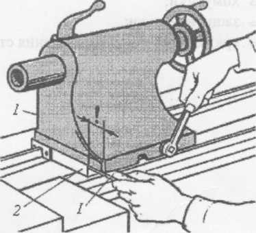 где Н - величина поперечного сдвига задней бабки, мм; L - общая длина детали, мм; l - длина конуса, мм; D - диаметр большего основания конуса, мм; d - диаметр меньшего основания конуса, мм. 1.2. Сместите корпус задней бабки (по делениям на ней) на себя. Смещение корпуса 1 задней бабки (рис. 1, а) по направляющим ее основания 2 на себя применяют при обработке конусов, устанавливаемых большим диаметром в сторону передней бабки. 1.3.