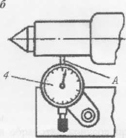 1.8. Сместите корпус задней бабки по индикатору. В резцедержатель закрепите индикатор 4 (рис. 4, б). Переместите индикатор до плотного упора его стержня А в пиноль. Установите корпус задней бабки на “0”. Сместите корпус задней бабки на требуемую величину Н по показаниям шкалы индикатора. 1.9.