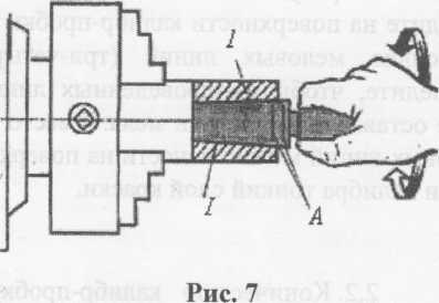 Отверстие по размерам будет выдержано, если торец заготовки 1 (рис. 7) находится в пределах рисок А, нанесенных на калибре I.