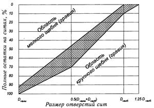 По полученным величинам строят кривую просеивания и сравнивают со стандартной областью допустимого колебания зернового состава крупного заполнителя (рис. 28).