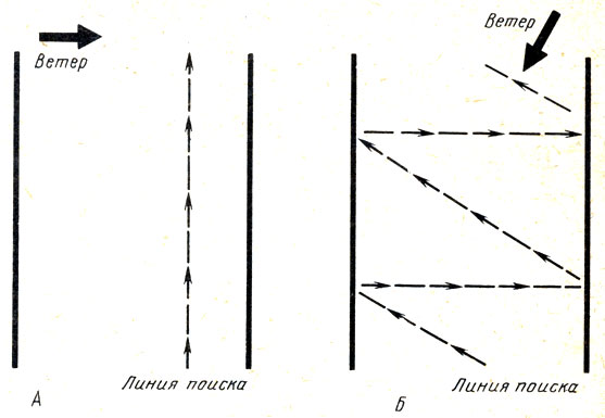 Поиск «коридором» при боковом ветре имеет свои особенности. Ветра, который постоянно дует под прямым углом к «коридору», в реальной обстановке почти не бывает. Практически он обычно приближается или к встречному под углом, или к попутному под углом. Однако на небольших отрезках «коридора» (особенно на сильно пересеченном рельефе при меняющемся направлении ветра) проводник может с ним столкнуться. При таком ветре «линия поиска» идет не посередине «коридора», а ближе к его подветренной границе. Это дает возможность собаке получать в данной обстановке максимум запаховой информации со всей площади. При направлении ветра к «коридору» под острым углом «линия поиска» идет зигзагами. Чередование коротких шагов зигзага с длинными в определенном порядке позволяет собаке находиться большую часть времени под наиболее выгодным углом к ветру. Используя направление ветра под различными углами, она получает максимум запахов с территории «коридора» и близлежащих участков (рис. 12).