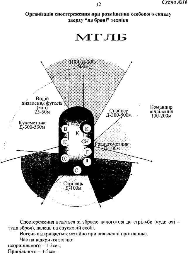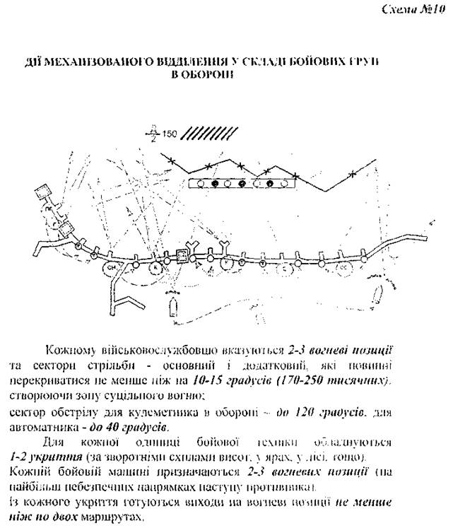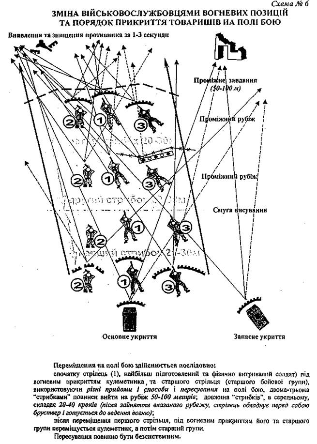 При виконанні завдання тебе зобов'язані прикривати твої товариші. За будь-яких обставин - «один за всіх - і всі за одного» - тобто один виконує завдання, а інші його прикривають, це закон ближнього бою. Їхнє завдання - знаходячись в укритті, вести спостереження за місцевістю і твоїм переміщенням, при виявленні противника відкривати вогонь не пізніше 1-3 секунд, не даючи йому вести прицільний вогонь по тобі. При висуванні (виконанні завдання) головний твій обов'язок - постійне і беззушшне спостереження на відстані до 300 м, у постійній готовності до відповідних дій із відкриттям вогню з боку противника; При відкритті вогню постійно змінюй вогневу позицію, зробив чергу -відповзи убік (перекотись) на 3-5 метрів і веди вогонь далі, потім - перебіжка. Не забувай про можливість знаходження мін, розтяжок і інших інженерних боєприпасів у напрямку твоєї дії. Перед початком дій не цоспішай, уважно оглянь місцевість на відстань 25-50 метрів, визнач маршрут свого просування, а також місце, куди ти повинен прибути із обов'язковим урахуванням можливості прикриття від вогню противника. Визнач місця, де може знаходитися противник і звідки він може вести по тобі вогонь, визнач свої можливі наступні дії, з урахуванням вогневого прикриття твоїх товаришів. Для цього в бойовій групі (двійці - трійці) заздалегідь повинні бути обговорені засоби і порядок спільних дій, а також порядок взаємодії в бою. Після зайняття чергового укриття, негайно розпочни спостереження за полем бою, будь у постійній готовності до вогневого прикриття переміщення інших військовослужбовців твоєї бойової групи. При можливості подальшого переміщення подай їм заздалегідь установлений сигнал на пересування до наступного рубежу. Надалі - умовними сигналами (Додаток №2)- уточнення завдання і - новий кидок. Не кидай товаришів на полі бою, без дозволу командира не залишай свого місця в бою, у випадку поранення, вживай необхідних заходів само- та взаємодопомоги і продовжуй виконувати завдання. Якщо буде наказано відправлятися на медичний пункт, візьми із собою особисту зброю. При неможливості прямувати до медичного пункту - відповзи в укриття зі зброєю і чекай санітарів. Слідкуй за витратою боєприпасів і заправкою бойової машини пальним. 25% носимого (возимого в бойовій машині) боєкомплекту і пального повинні бути недоторканими, це «НЗ». Швидко вживай заходів щодо відновлення ушкоджених бойової техніки та озброєння.