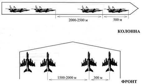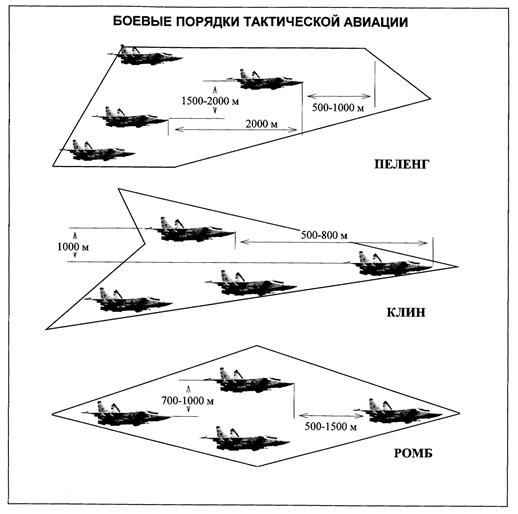 На основе опыта учений ОВВС НАТО и локальных конфликтов тактическая авиация при нанесении ударов будет действовать малыми группами (2-6 самолетов) и одиночными самолетами, распределенными по фронту и на различных высотах. Боевой порядок (строй) - размещение СВН в воздухе между собой определенным образом в целях достижения эффективности управления и максимально возможных результатов во время нанесения ударов по наземным объектам. В зависимости от дистанций, интервалов между самолетами (группами самолетов) боевые порядки подразделяются на сомкнутые (применяются на этапах полета до зоны обнаружения РЛС противника и не связаны с решением задач по нанесению ударов) и разомкнутые (применяются в зонах действия ЗРК системы ПВО противника). Строи авиации не являются постоянными, а изменяются в зависимости от обстановки. Максимальное использование боевых возможностей самолетов достигается в том случае, когда они рассредоточены в строю на высоте, в глубину и по фронту. Построение боевых порядков самолетов постоянно совершенствуется на основе опыта учений, локальных конфликтов, совершенствования самолетов, их оборудования и вооружения, систем вооружения. Основой боевого порядка является пара самолетов. Она действует, как правило, в боевом порядке “пеленг”, “фронт”, реже “колонна”. Из пар состоят боевые порядки звеньев (4 самолета). Для звена наиболее характерными формами построения являются " клин”, “пеленг”, “ромб”, “колонна”, “фронт”, в которых самолеты эшелонируются по высоте и рассредоточиваются на интервалы в пределах визуальной видимости (Рис.20). В каждом боевом порядке имеются ведущие и ведомые летчики и пары. Как правило, задача ведущего - атака, ведомого - наблюдение и оповещение, а также огневая поддержка. Однако в последнее время эти различия стираются, и оба - ведущий и ведомый - должны наносить удары по целям, поддерживая между собой тесное огневое взаимодействие. В более крупных боевых порядках ТА действуют при полете до рубежа обнаружения средств разведки противника, после которого боевой порядок расчленяется на малые группы (2-4 самолета) и одиночные самолеты для атаки на цели. Атака цели - это сочетание огня и маневра. Под термином “огонь” следует понимать применение средств поражения. Видами огня являются бомбометание, пуски управляемых и неуправляемых ракет, применение стрелково-пушечного вооружения.