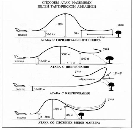 Атака с пикирования позволяет осуществить бомбометание, запуск управляемых ракет, стрельбу НУР и огонь из стрелково-пушечного вооружения. Таким образом, в одной атаке возможно применение всего комплекса средств поражения. К цели самолет может совершать полет на высоте 30-200 м, а на расстоянии 8-10 км от цели выполняют маневр “горка” до высоты входа в пикирование (2000-3500) м, прицеливание под углом 15-60о, резкое снижение, применение вооружения и маневр. Этот способ атаки имеет высокую точность поражения целей, возможность применения различного вооружения и оказывает сильное психологическое воздействие на ичный состав противника. Недостатки: значительное время пребывания в зоне поражения ЗРК, невозможность совершения маневра при пикировании до применения вооружения. Бомбометание с кабрирования применяется при сбрасывании фугасных бомб или мелких осколочных бомб из кассет по площадным целям (войскам в районах привалов, отдыха, артиллерии на огневых позициях). Прицеливание осуществляется при горизонтальном полете. Момент перехода в кабрирование определяется с помощью прицела. Сброс бомб осуществляется в течение 3-10 с на высотах 100-1000 м. Применение УР считается целесообразным при атаках с горизонтального полета. Противорадиолокационные ракеты типа “Харм”, “Аларм”, “Шрайк” в целях достижения внезапности должны запускаться на работающие РЛС с дальностей 20-25 км со средних высот (1500-2000 м). НУР и стрелково-пушечное вооружение применяются для поражения малоразмерных наземных целей (РЛС, БМ, зенитное орудие), а также живой силы вне укрытий и войск на марше при атаках с пикирования.