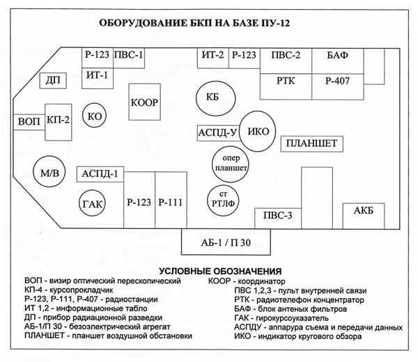 Для обеспечения связи в зенитной ракетной батарее используется большое количество разнотипных радиостанций, установленных как на подвижных объектах, так и используемых в переносном варианте. Унифицированный батарейный командирский пункт «УБКП» – 9С737 “Ранжир” предназначен для: -автоматического приема и отображения информации о воздушной обстановки; -автоматического сбора данных о состоянии и положении источников информации, выработки рекомендаций по целераспределению и выдачи целеуказаний; -обеспечение управления боевыми действиями зенитных подразделений вооруженных ЗРК и ЗРС 9К331, 2С6, 9К321; В комплект УБКП входят: 1. Комплекс автоматизации. 2. Комплекс средств связи. 3. Средства навигации и топографической привязки 4. Система электропитания 5. Система жизнеобеспечения Подвижный пункт управления ПУ-12 (9С682) предназначен для приема и передачи данных о воздушных целях и обеспечения управления боевыми действиями зенитной ракетной батареи. В состав ПУ-12 входят (Рис.44): 1. Аппаратура съема и передачи данных АСПД-У. 2. Информационное табло ИТ-1, ИТ-2. 3. Планшет воздушной обстановки. 4. Аппаратура связи (Р-111 -1шт, Р-407 -1шт, Р-123 -3шт, Р-124 -4шт, радиотелефонный концентратор) 5. Аппаратура навигации. 6. Система защиты от ОМП. 7. Система электропитания.