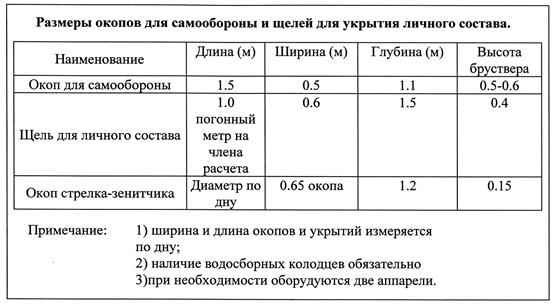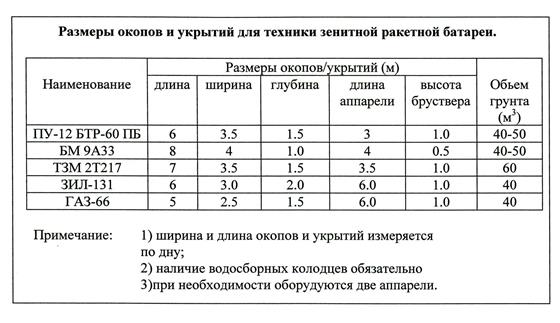Все работы по инженерному оборудованию должны производиться с учетом соблюдения правил тактической маскировки. При заблаговременной подготовке СП может быть использована инженерная техника, имеющая следующую производительность: 1. Путепрокладчик БАТ-2 - 160 м3/час 2. Котлованная машина МДК-3 - 500-600 м3/час 3. Экскаватор ЭОВ-4421 - 50-60 м3/час