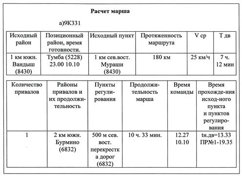 1. Уточнить позиционный район и время готовности в нем. 2. Определить исходный пункт R³ (n-1)dм, где R- удаление исходного пункта от СП, n - количество машин в колонне, dм - дистанция между машинами. 3. Определить протяженность маршрута (по карте). 4. Задавшись значением средней скорости движения определить время движения. t дв. =D/Vср. 5. Определить количество суточных переходов, привалов и их продолжительность. 6. Выбрать по карте районы привалов и пункты регулирования. 7. С учетом времени свертывания батареи в походный порядок и развертывание ее в новом позиционном районе, времени вытягивания колонн и втягивания ее в новый район, времени на привалы, определить общую продолжительность марша. 8. Определить время подачи команды на свертывание батареи и время прохождения его исходного пункта. 9. Определить время проведения привалов и время прохождения пунктов регулирования. Результаты расчета марша оформляются в виде таблицы на оборотной стороне рабочей карты (Рис.62, 63).