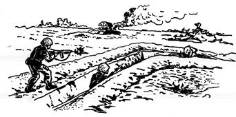 Рис. 5 Огневая позиция РПГ-7. Если отдельные группы атакующего противника ворвались в траншею, солдат должен немедленно установить заранее заготовленные заграждения в виде «ежей» и «рогаток» из колючей проволоки и уничтожать вклинившегося противника огнем в упор, гранатами и в рукопашном бою. Во всех случаях, без приказа командира или лица его заменившего, позиция не покидается и бой ведется до полного уничтожения противника. Противника, вклинившегося на позицию соседнего отделения, уничтожают огнем с запасных позиций или проведением контратаки. Отразив атаку, следует немедленно пополнить боекомплект, оказать помощь раненым товарищам и, исправив повреждение окопа (траншеи, хода сообщения), приготовиться к отражению повторной атаки. Отход на другую позицию производится только по приказу старшего командира под прикрытием огня артиллерии, минометов и боевых машин, а также огня товарищей. Производить отход следует скрытно по ходам сообщения, используя складки местности, а по открытой местности - короткими перебежками. Перед отходом следует тщательно проверить все окопы и укрытия с целью выявления и эвакуации раненых товарищей. При отходе в развернутом боевом порядке категорически запрещено изменять свое место в цепи, во избежание поражения огнем соседних солдат.