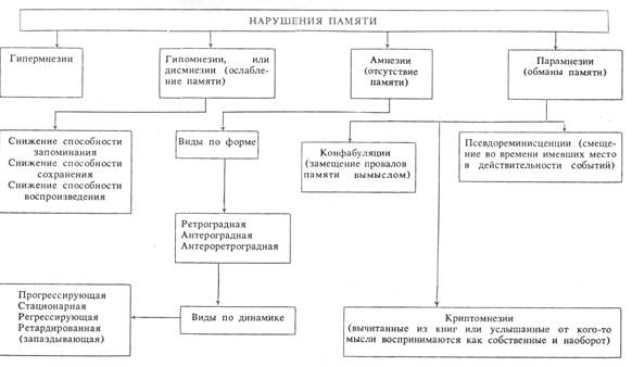 Среди законов формирования мнестических расстройств наиболее известным считается закон Рибо, в соответствии с которым нарушения (утрата) памяти (также как и ее восстановление) происходят в хронологическом порядке — вначале утрачивается память на наиболее сложные и недавние впечатления, затем — на старые. Восстановление происходит в обратном порядке. В психиатрической клинике у больных после черепно-мозговых травм, опухолей головного мозги, гематом нередко встречается Корсаковский амнестический синдром, который включает в себя фиксационную амнезию и парамнезии (конфабуляции, псевдореминисценции). Часто у больных с амнестическим синдромом нарушается ориентировка в месте и времени.